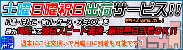 チタン印鑑、水晶印鑑、ゴム印等、平日の即日出荷は可能でも『土日祝日出荷サービス』対象外の 商品もございます。詳しくはこのページの対応商品一覧、または商品個別ページにてご確認下さい。 |